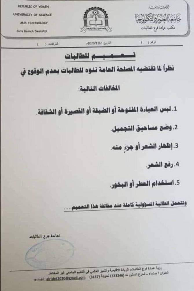 وكانت مليشيا الحوثي قد أقدمت على إصدار تعاميم تقضي بمنع طالبات جامعة العلوم والتكنلوجيا المنفصلة عن البنين من استخدام مساحيق التجميل أو استخدام العطر والبخور، في تصرفات تشبه الممارسات التي نفذها تنظيم داعش في سوريا والعراق.