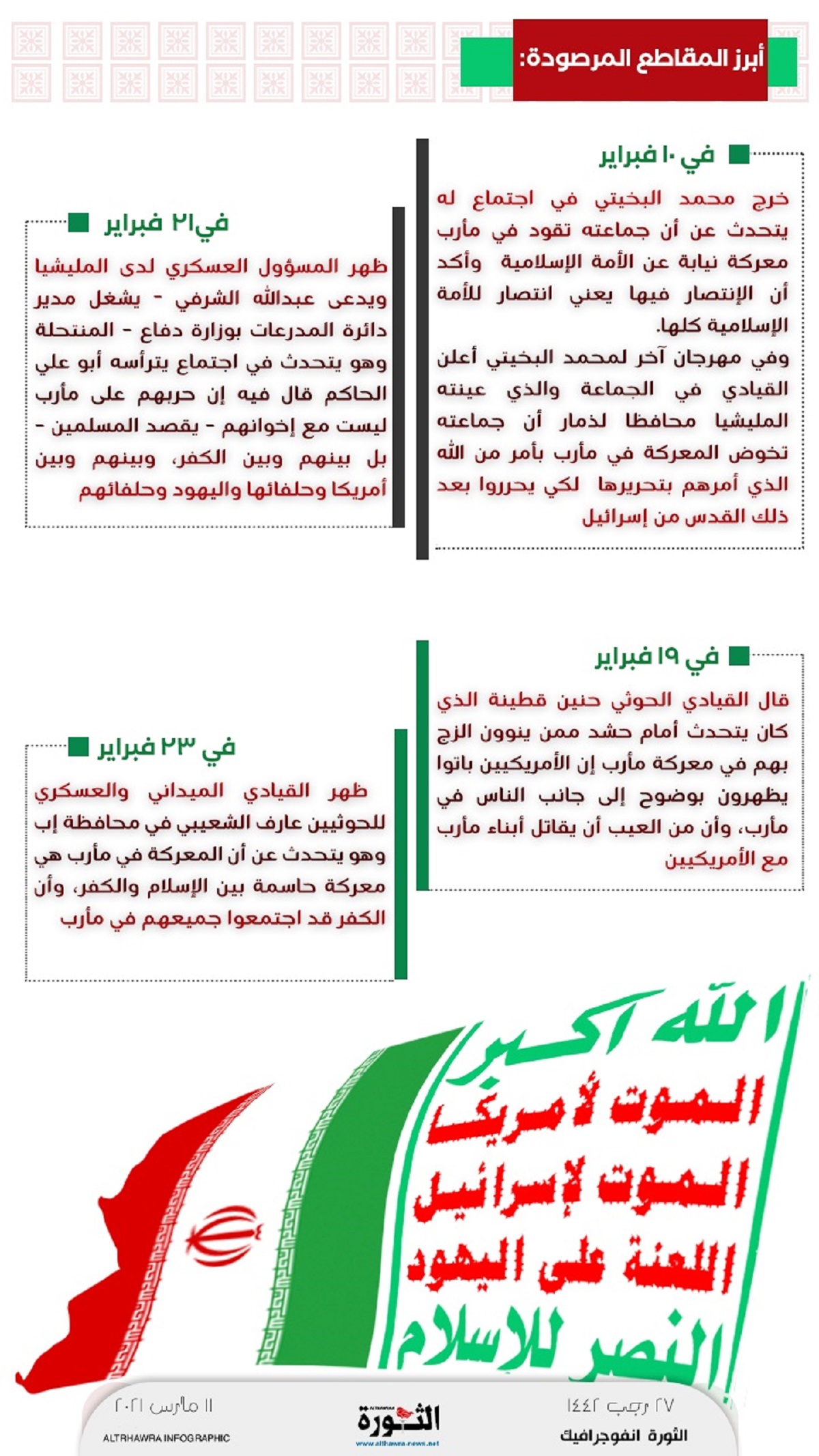 - في 23 فبراير ظهر القيادي الميداني والعسكري للحوثيين عارف الشعيبي في محافظة إب وهو يتحدث عن أن المعركة في مأرب هي معركة حاسمة بين الإسلام والكفر، وأن الكفر قد اجتمعوا جميعهم في مأرب.