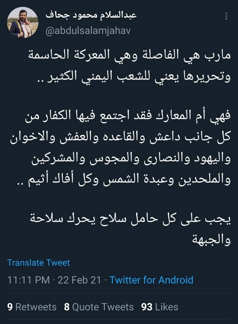 وفي تغريدة له قبل أن يحذفها نشر القيادي الحوثي عبدالسلام محمود جحاف ممثل الحوثيين في مؤتمر الحوار الوطني تغريدة قال فيها إنه في مأرب اجتمع فيها الكفار من كل جانب داعش والقاعده والعفش والاخوان، واليهود والنصارى والمجوس والمشركين والملحدين وعبدة الشمس وكل أفاك أثيم".