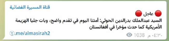 وعلق زعيم مليشيا الحوثي على سيطرة طالبان على كابل في كلمة له ألقاها اليوم قائلا: "أمتنا اليوم في تقدم واضح، وبات جلياً الهزيمة الأمريكية كما حدث مؤخرا في أفغانستان" وفق مانقلته قناة المسيرة الحوثية.