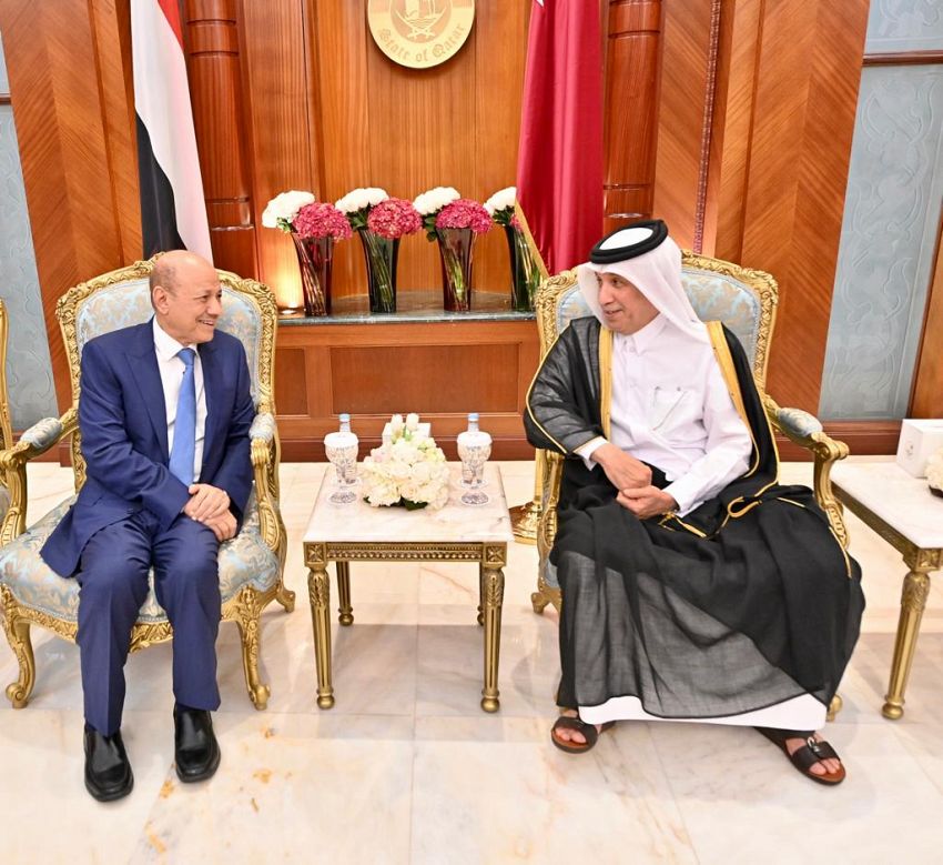 رئيس مجلس القيادة الرئاسي وامير دولة قطر يعقدان لقاءاً موسعاً لتعزيز العلاقات بين البلدين الشقيقين