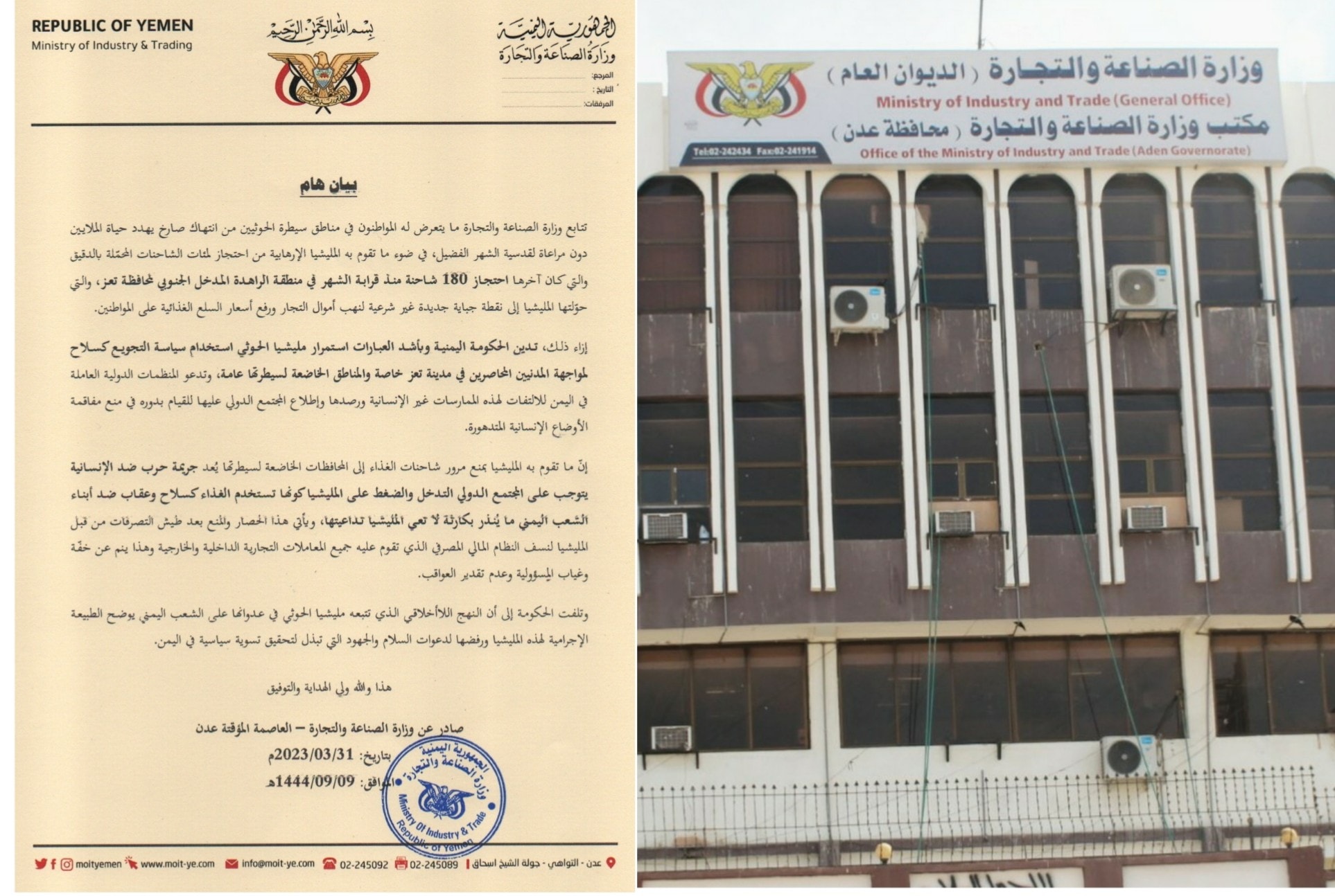 وزارة الصناعة تدين استمرار الحوثيين بسياسة التجويع ضد المدنيين