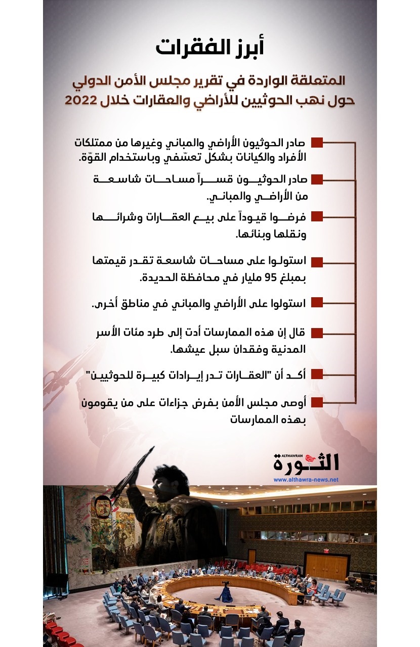 إنفوغرافيك بأبرز الفقرات الواردة في تقرير الخبراء حول نهب الحوثيين للأراضي