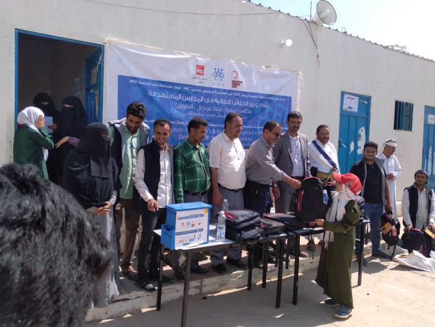 تدشين توزيع 3 الاف حقيبة مدرسية مع المستلزمات للنازحين بمخيم الجفينة في مأرب