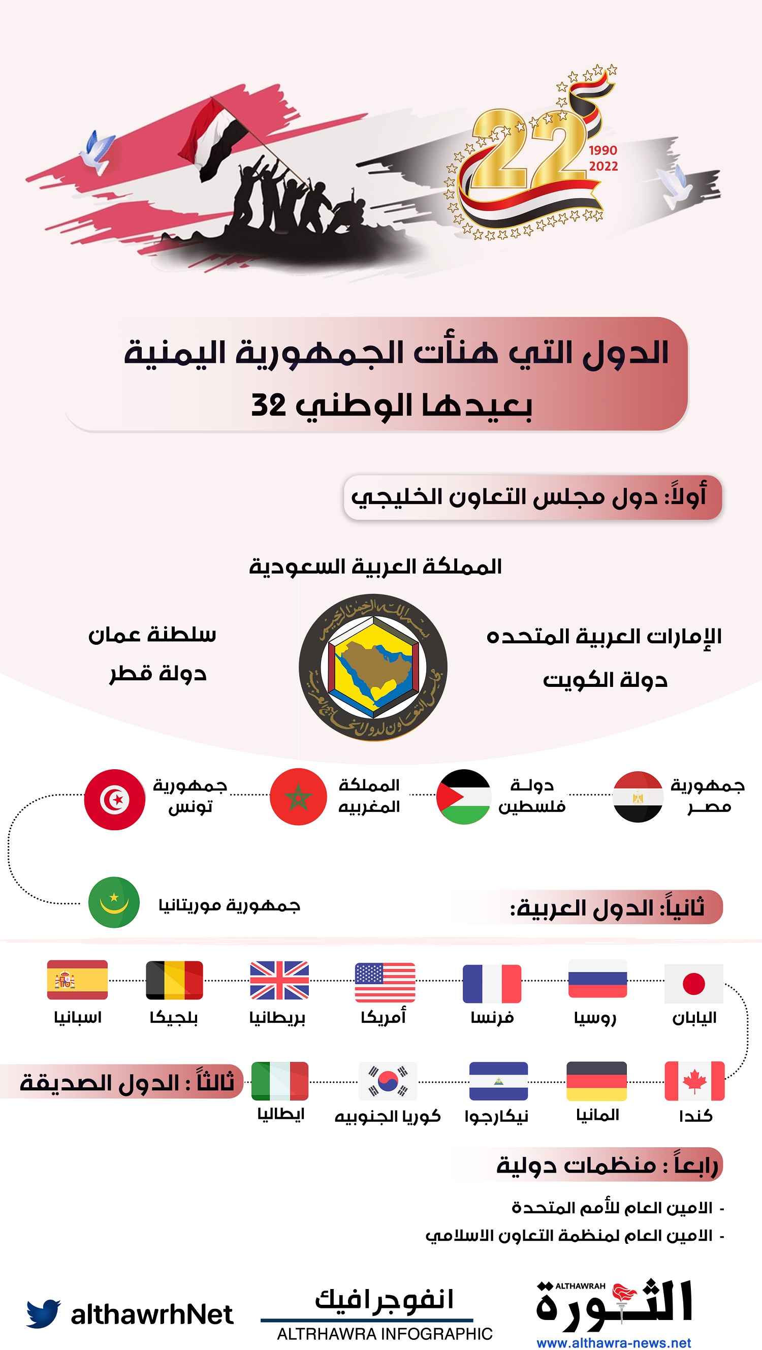 إنفوغرافيك يوضح الدول التي هنأت الجمهورية اليمنية في عيدها الوطني 32