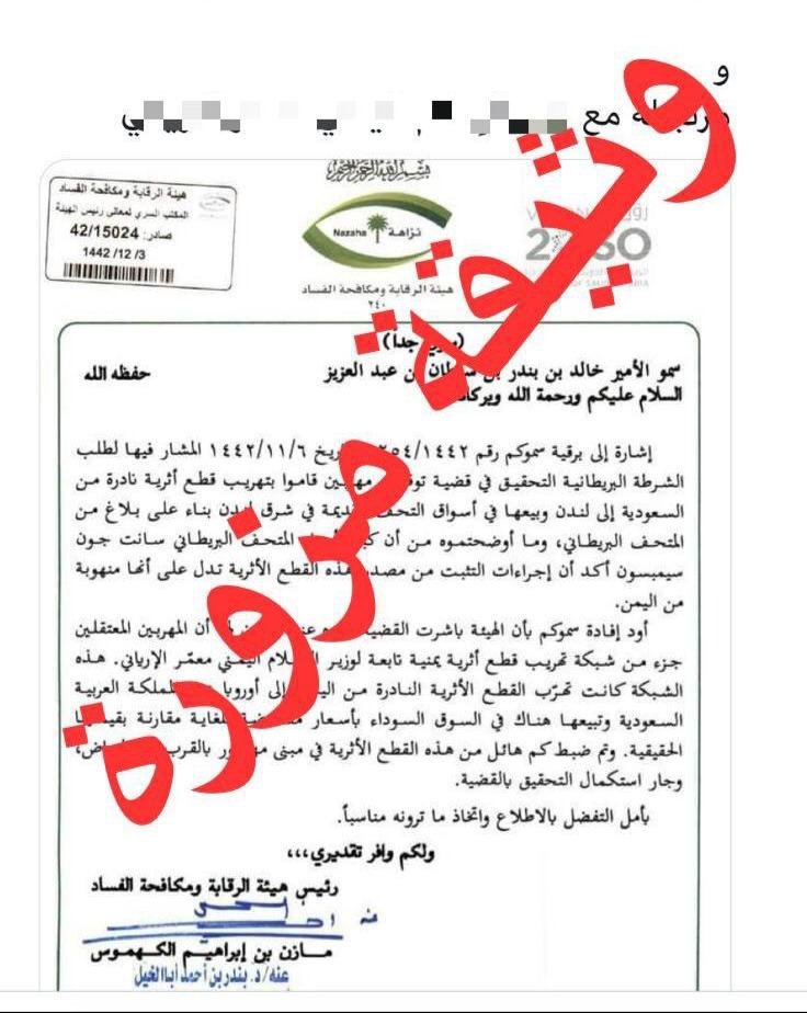 علَّقت هيئة الرقابة ومكافحة الفساد في السعودية على وثيقة متداولة تشير إلى متباعتها قضية تهريب آثار من اليمن وبيعها في بريطانيا.