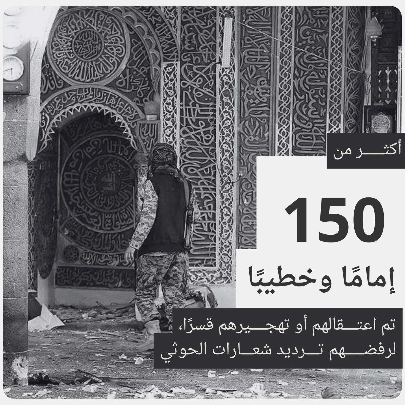 ووفقاً لتقارير حقوقية وإعلامية محلية، فقد تعرض أكثر من 750 مسجدًا في مختلف المحافظات اليمنية للانتهاك خلال السنوات الأخيرة، بين هدمٍ واستيلاءٍ وتحويلٍ قسريٍ للاستخدام، فيما تم اعتقال أو تهجير أكثر من 150 خطيبًا وإمامًا من منابرهم في صنعاء وذمار وإب والحديدة، بعد رفضهم ترديد شعارات الجماعة.