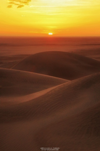 حتى الصحراء أخذت بعد مختلف في عدسة عبدالله حين التقطها عند غروب الشمس كانت اللوحة كاملة الألوان والضوء، مجرد النظر إليها يلامس الروح حتى لمن ليسوا مصورين.
