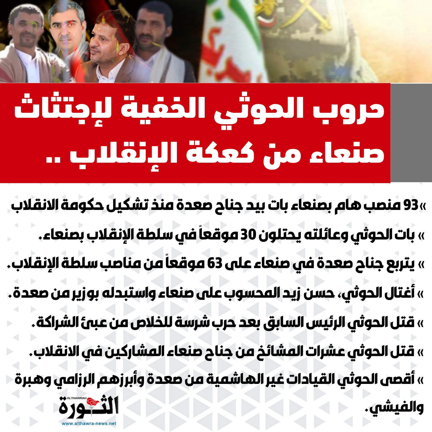 وتأتي الحرب السرية التي يخوضها جناح صعدة للخلاص من جناح صنعاء في ظل مساعي الانقضاض على ما تبقى من تواجد لصنعاء في مناصب السلطة المغتصبة.