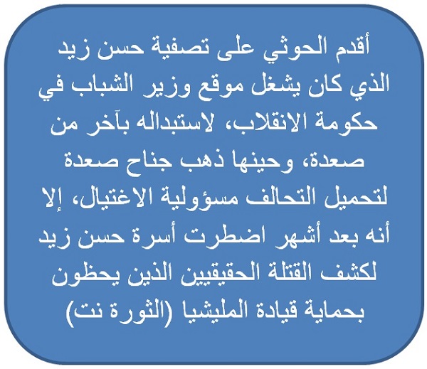 وألصق جناح صعدة تهمة تصفية حسن زيد حينها للتحالف العربي، معلنا عن مقتل قاتليه أثناء الملاحقة، إلا أن تلك الأكذوبة لم تصمد، فبعد مرور 9 أشهر على التصفية اضطرت أسرة حسن زيد للإفصاح عن القاتل الحقيقي، رافضة محاولات إخفاء الجناة واتهام جهات لا علاقة لهم بما جرى.