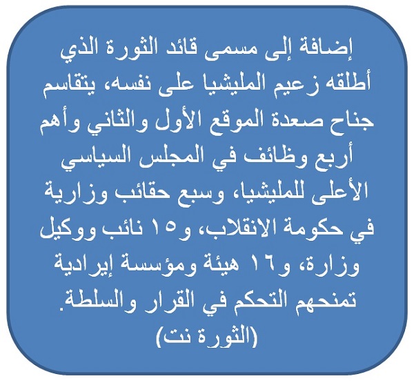 ورصد موقع "الثورة نت" 90 موقعًا ومنصبًا احتلها جناح صعدة، منذ تشكيل ما يسمّى بـ"المجلس السياسي الأعلى" في 28 يوليو 2016، بخلاف موقع "قائد الثورة" الذي أطلقه زعيم المليشيا على نفسه، والذي يتحكم ويشرف على كل شيء في سلطة الانقلاب.